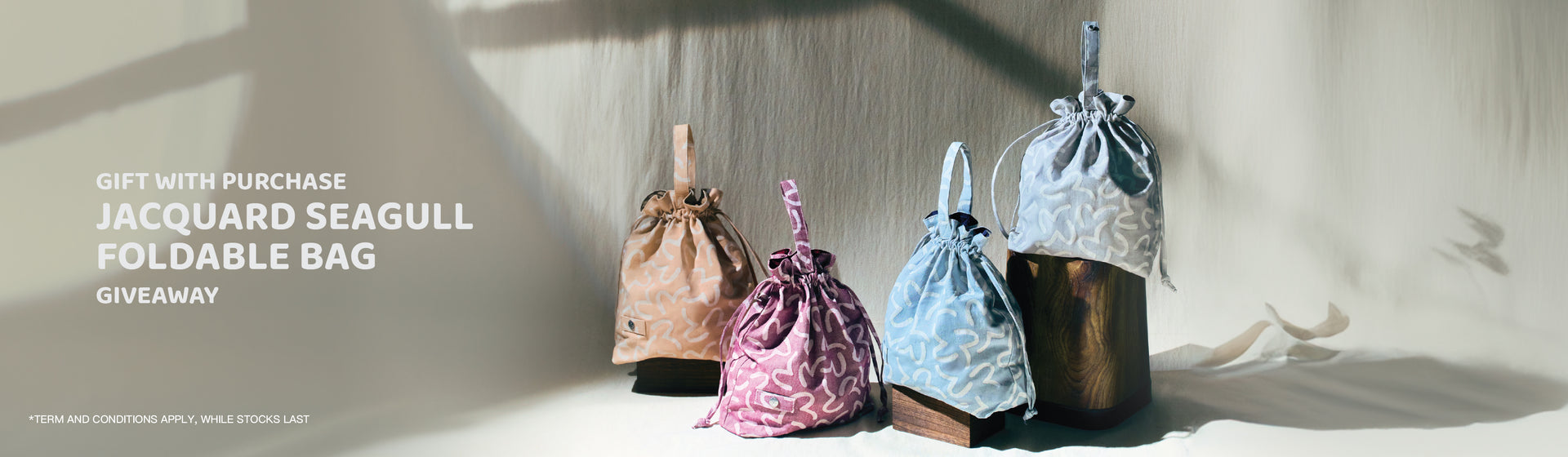 Receive a complimentary Jacquard Seagull Foldable Bag with a minimum net purchase of SGD530. Gift colors are randomly distributed, while supplies last.*