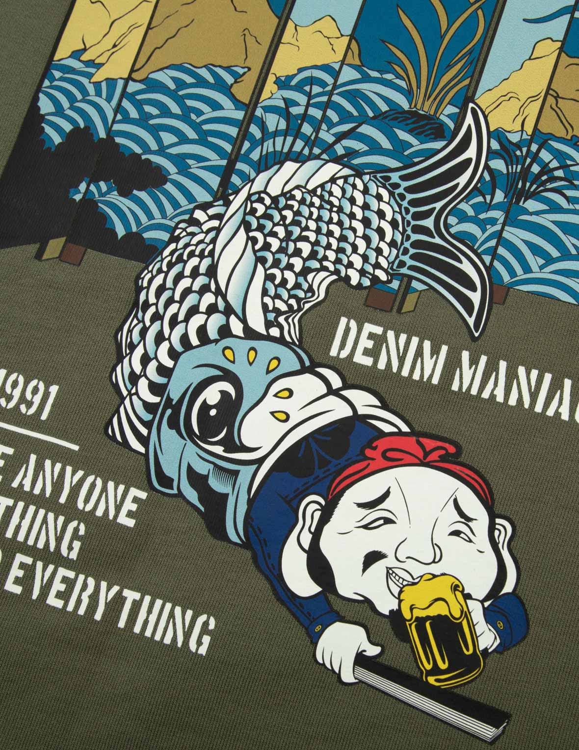 The loose-fitting silhouette of this sweatshirt showcases a layout on the back that incorporates Japanese elements. The vibrant combination of the Godhead and Koinobori adds a playful touch. The overall pattern features a harmonious and soft color palette, creating a stylish and whimsical look.