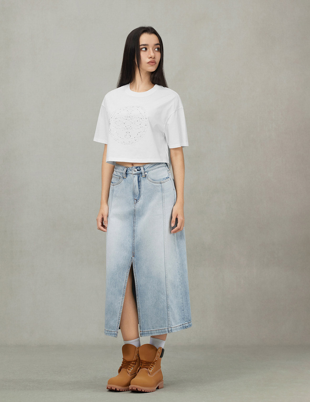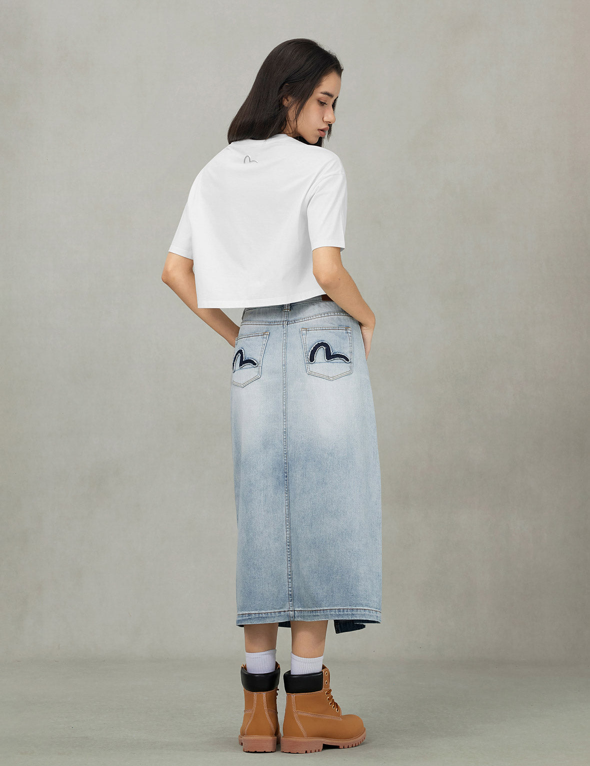 Washed Deconstructed Seagull Fashion Fit Demin Midi Skirt