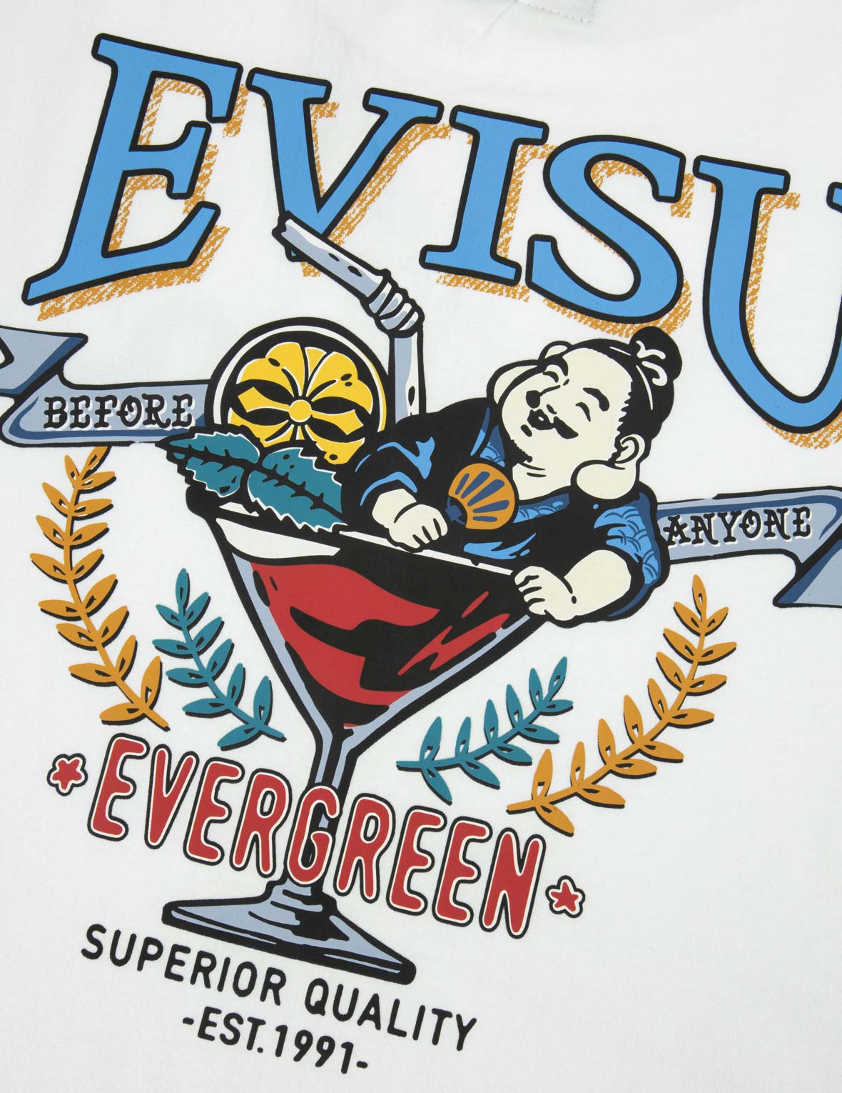 EVISU cleverly combines the brand with playful elements, showcasing a style that is both fashionable and playful. The front of this T-shirt features contrasting-colored seagull prints, while the back showcases a playful Godhead appearing in a cocktail glass, accompanied by brand wordings.