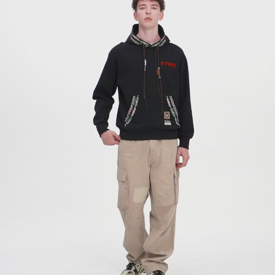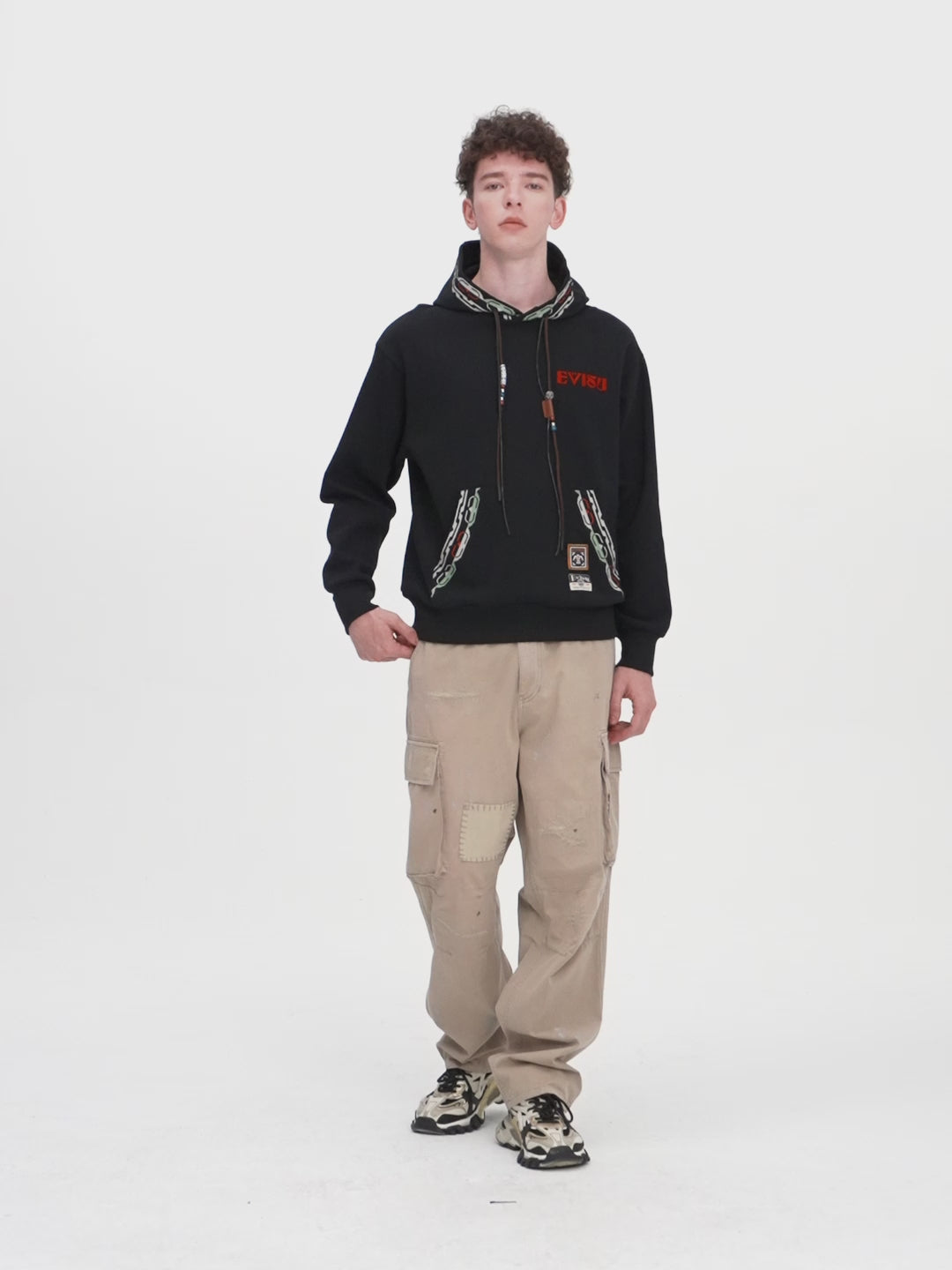 Introducing these straight-leg work pants that fuse totem-inspired elements with the brand's superior craftsmanship. The vintage wash, combined with various worn effects, showcases casual stitching details and patchwork. The hand-painted ink accents infuse the pants with a fashionable edge, perfect for those who value individuality.