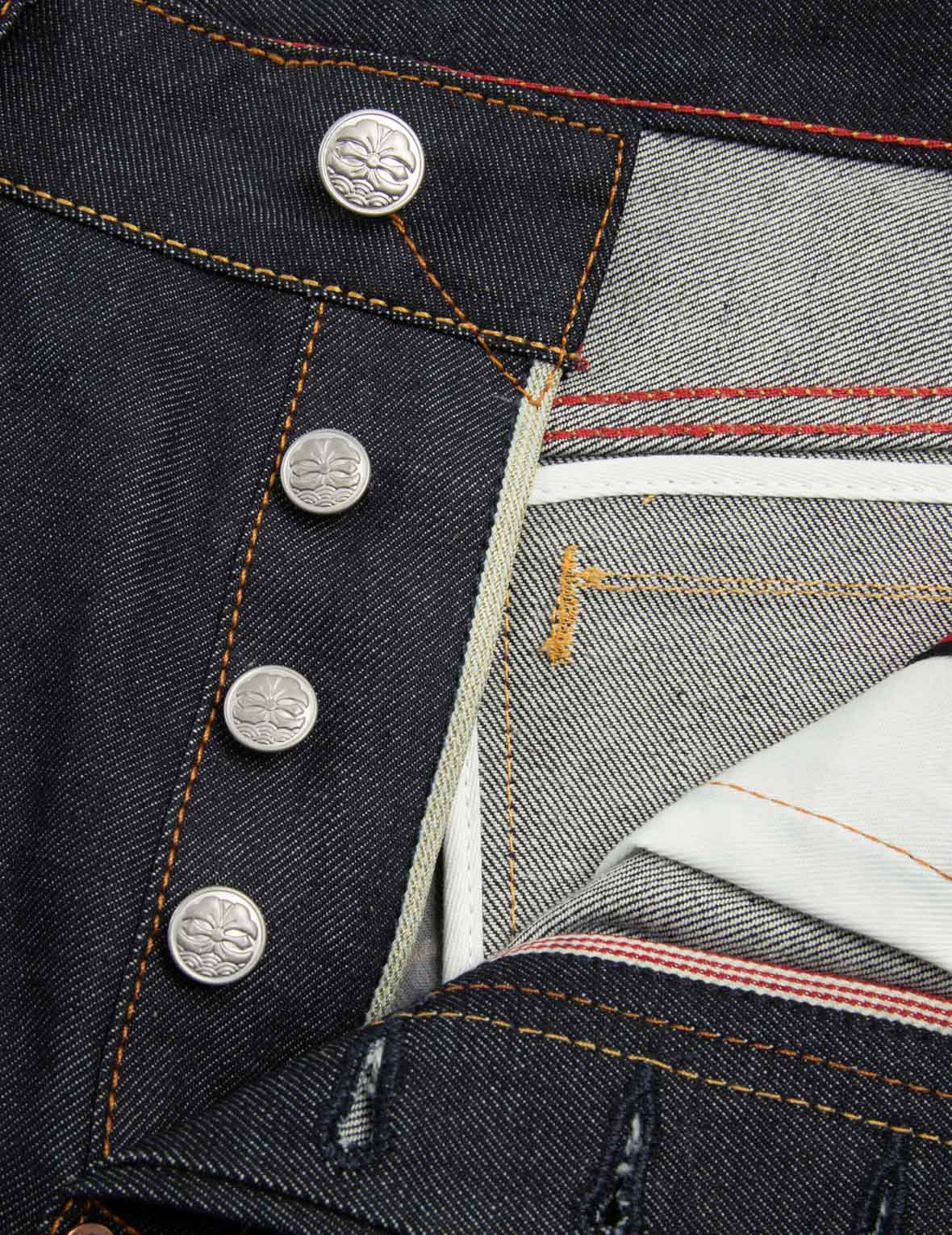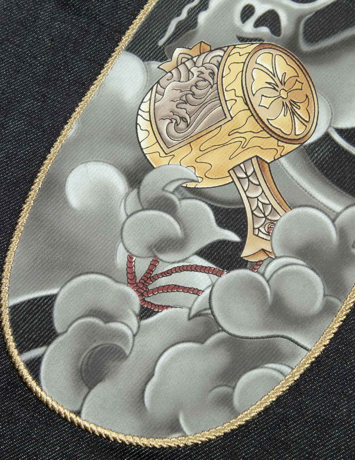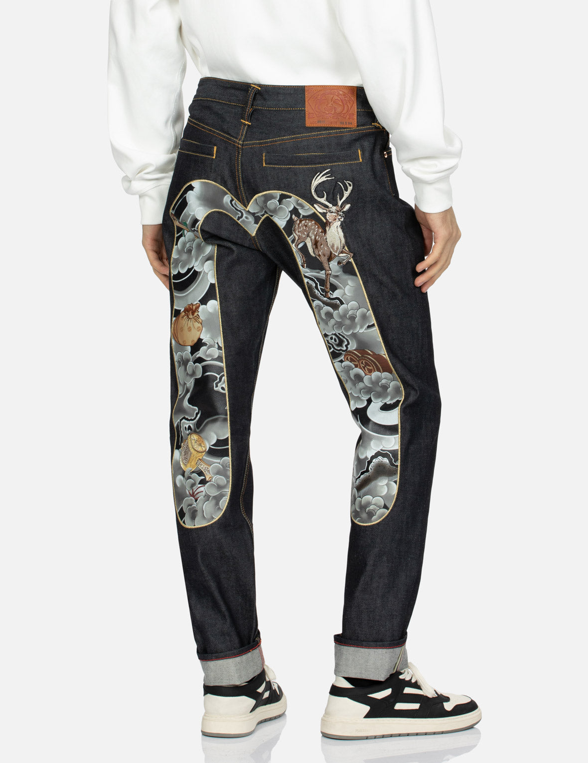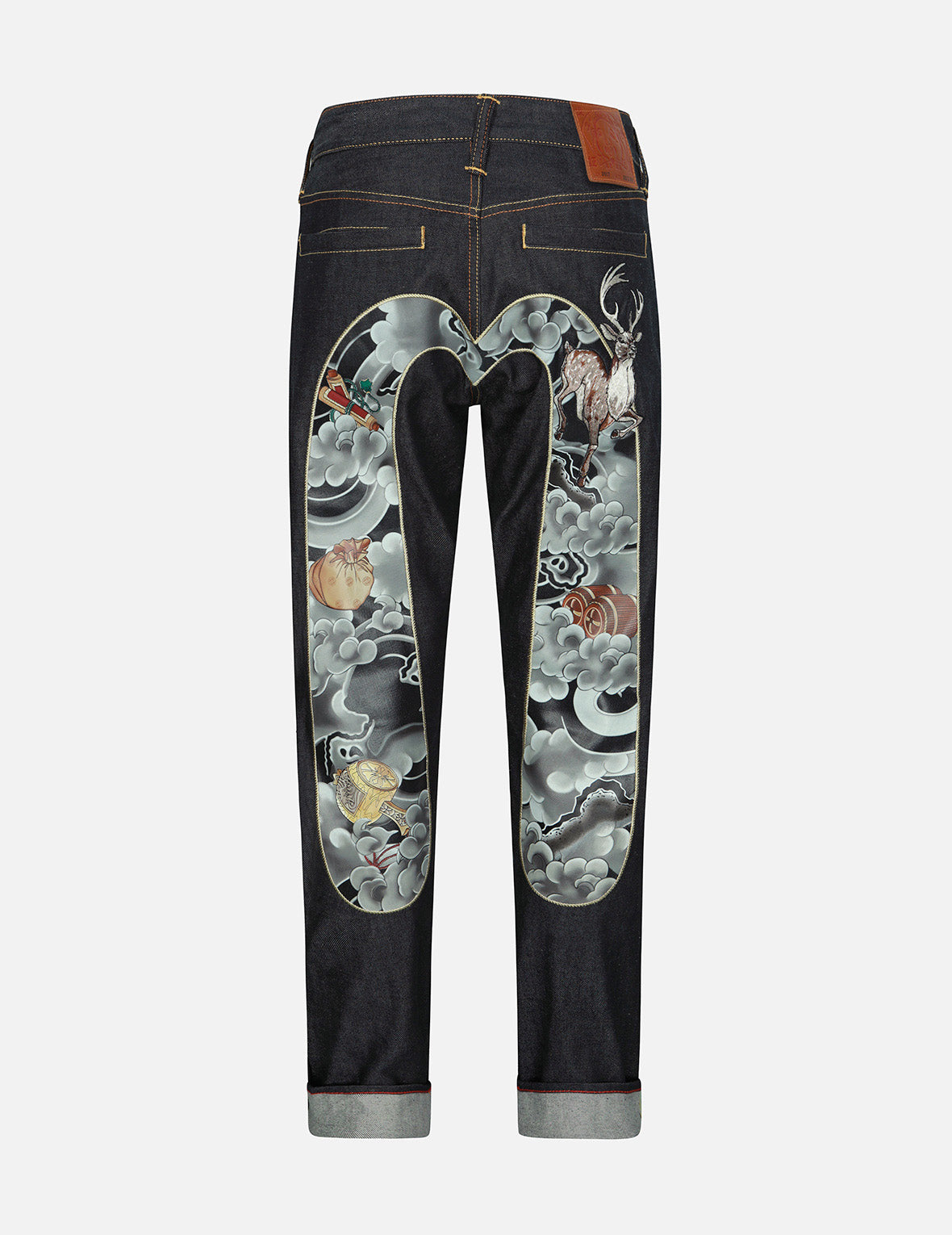 Drawing inspiration from the deity deer and treasures in Japanese folklore, EVISUs taper-fit selvedge denim jeans are decorated with a back Daicock in cloud and treasure pattern outlined with gold cord embroidery. The sophisticated deer embroidery is a symbol of longevity and good health.