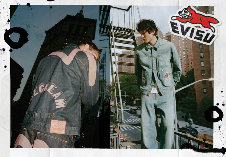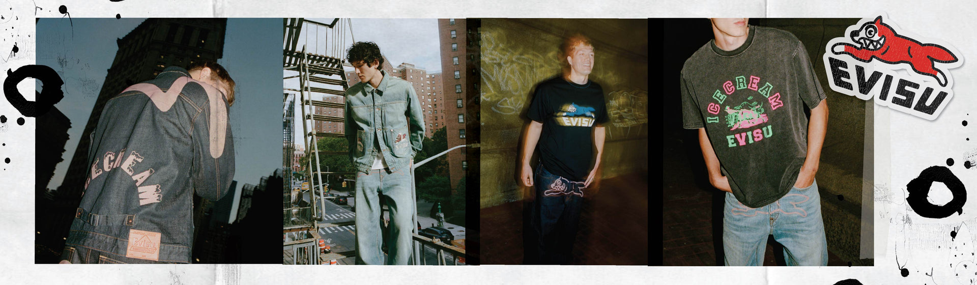 融合 EVISU 复古元素与 ICECREAM 美式街头风格及大胆印花元素,呈现在 EVISU 经典丹宁之上,并以两大品牌的标志性图案——EVISU Daicock、ICECREAM Running Dog、复古牛仔洗水及红边牛仔布为亮点。