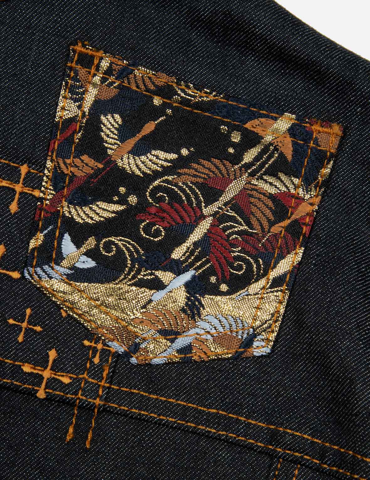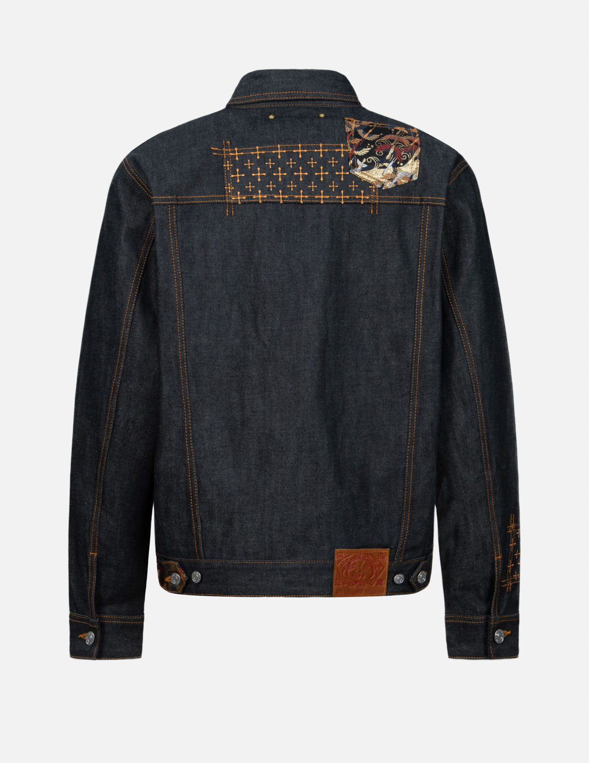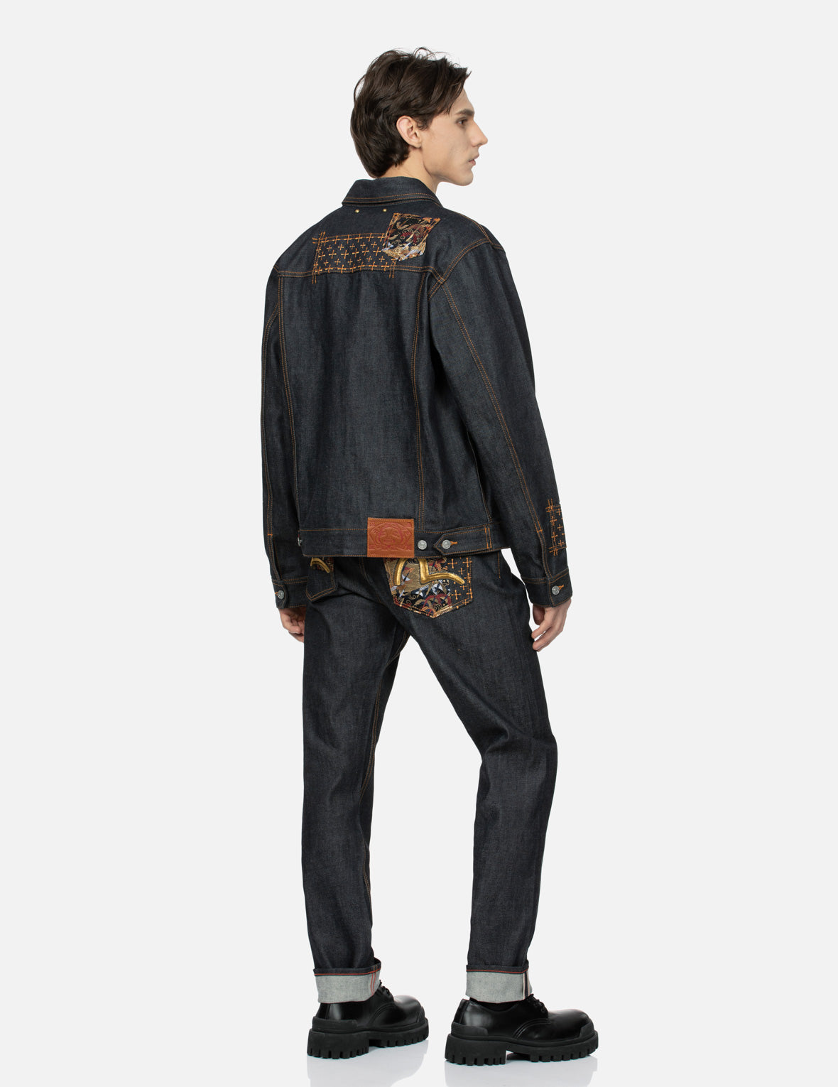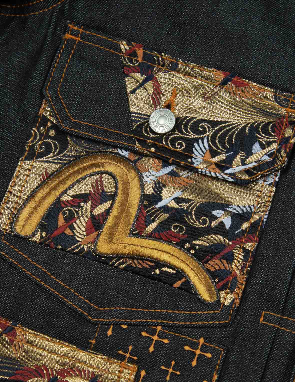 EVISU 把一系列东方美学工艺注入设计,这件休闲牛仔外套剪裁宽松,并以蚂蚁纹样线迹拼布和云中鸟织锦口袋点缀,饱含吉祥的意味。襟袋上的金色小海鸥刺绣为单品添上奢华感。