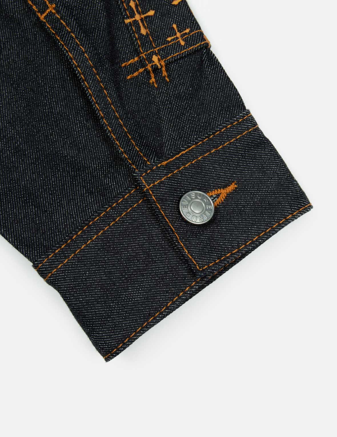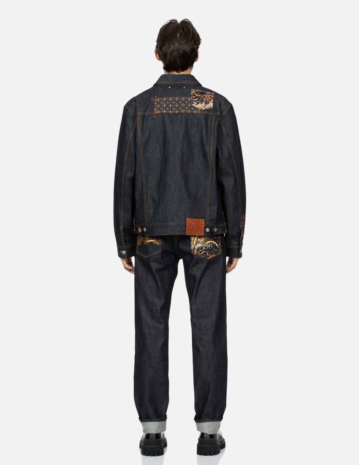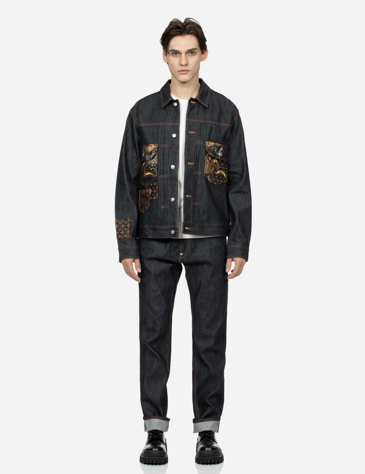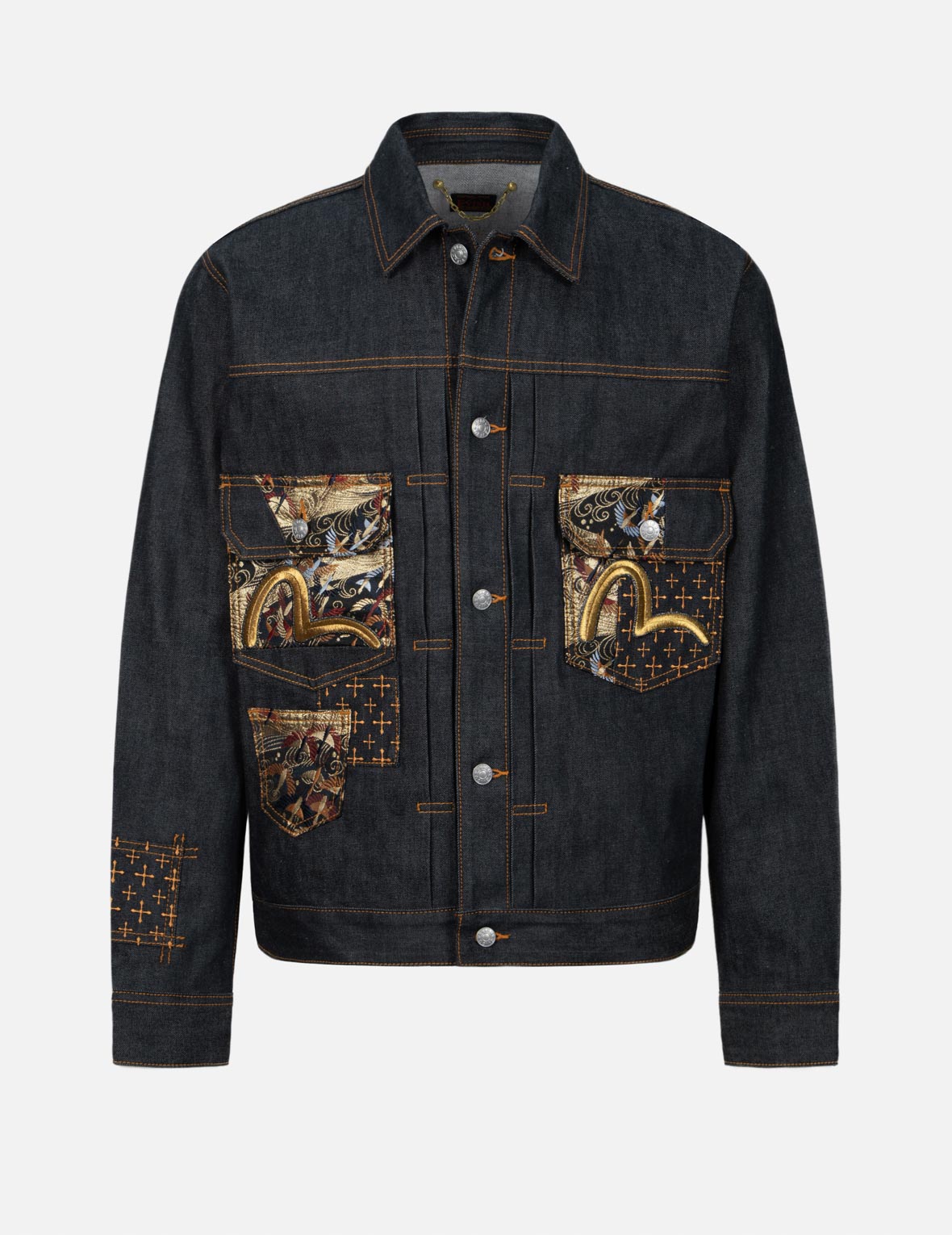 EVISU 把一系列东方美学工艺注入设计,这件休闲牛仔外套剪裁宽松,并以蚂蚁纹样线迹拼布和云中鸟织锦口袋点缀,饱含吉祥的意味。襟袋上的金色小海鸥刺绣为单品添上奢华感。